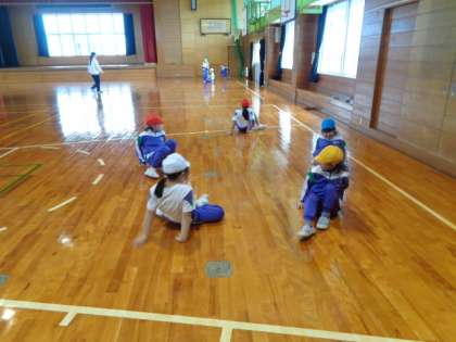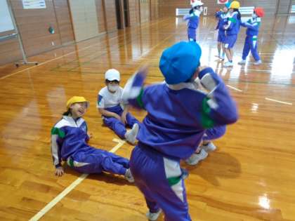 先生が提示した、はじめ・中・終わりのある簡単な話を、全身で表現します。