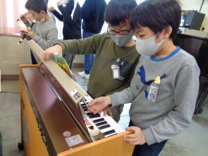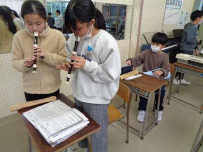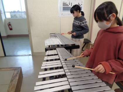 2グループに分かれて「威風堂々」の合奏に取り組んでいます。友達と教え合ったり、合わせたりしながら楽しく練習しています。