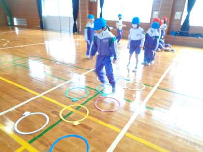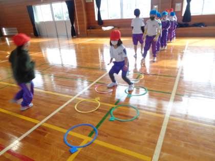 「けんステップ」でリズムよく跳ぶ子供たち。自分たちで並べ方や跳び方も工夫しました。