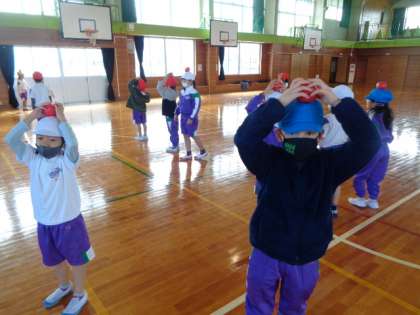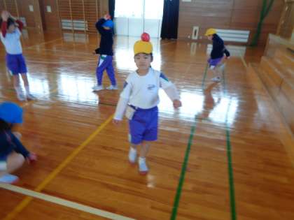 玉入れの玉を頭に乗せて、バランスをとりながら歩いたり座ったりしました。また、上に投げてから拍手をしてキャッチしたり、回ってキャッチしたり、色々な動きをして楽しみました。