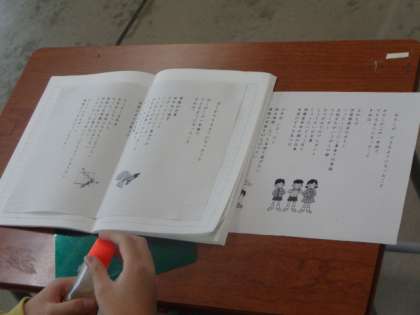 教科書に掲載されている、まどみちおさんの詩の文体を借りて、自分の成長を詩にまとめました。完成した詩を音読し合って、互いの成長を確かめていました。