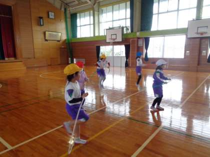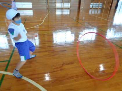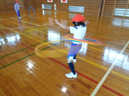 5つ同時に回したり、転がしたフープの中にぱっと入ったり、色々な遊びを試すことができました。