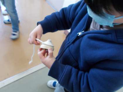今日は始めに、みんなで仲良く遊ぶためのルールを決めました。「けん玉やこまを投げたり振り回したりしない」「順番を守る」等、みんなで決めたことをしっかりと守り、楽しく遊ぶことができました。