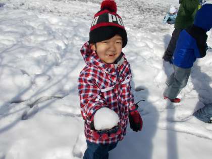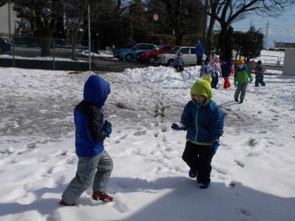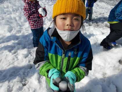 雪玉をきれいに丸くしたり、ダイナミックに尻滑りをしたりと、たくさん遊んで大満足の子供たち。好天の下で、子供たちの笑顔が弾けていました。