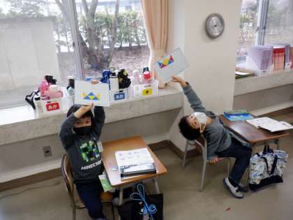 教科書は最後の単元に入りました。色板を並べて先生が提示した形と同じ形を作っています。