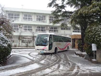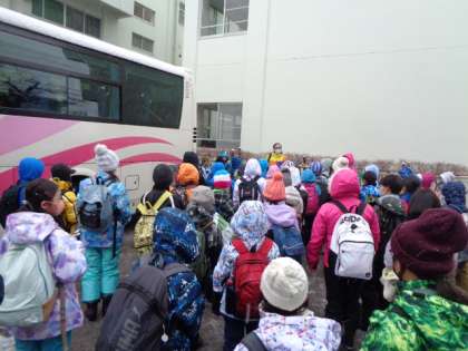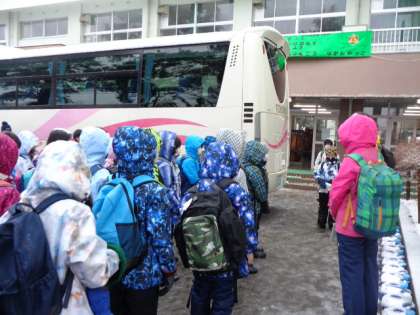 雪だるまマークに流れる雪が付く天候の中、元気に4、5年生の子供たちは、富山市子どもの村に向けて出発しました。この雪の中でしか味わえない貴重な体験から、いくつもの学びがきっとあります。