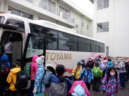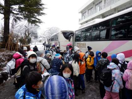 2度の延期を経て、やっと実現が叶った校外学習に出かけます。出発式とバス乗車の様子です。