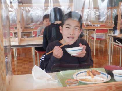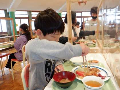 昼食の様子です。たくさん遊んだだけあって、何回もおかわりをして、たくさん食べていました。