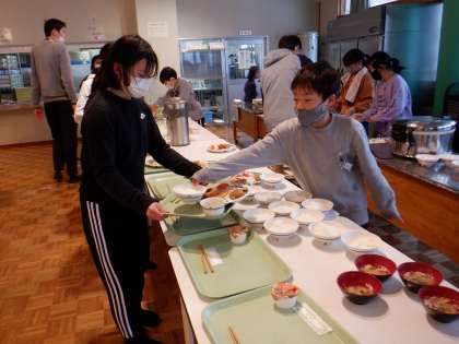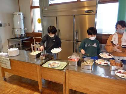 食事係の子供たち。配膳や後片付け等、責任をもって取り組むことができました。係のみなさん、ありがとう!