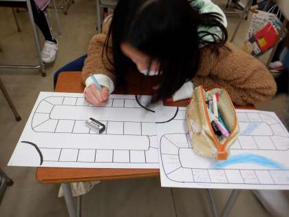「未来の自分すごろく」を作っています。夢いっぱいの子供たち。素敵な未来が待っていることでしょうね。