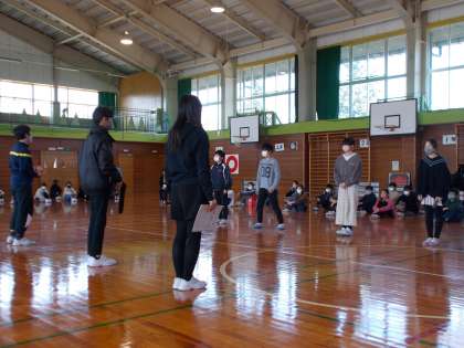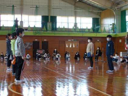 児童会引き継ぎ式を行い、4〜6年生は体育館で、1〜3年生はMeetを使って教室で参加しました。