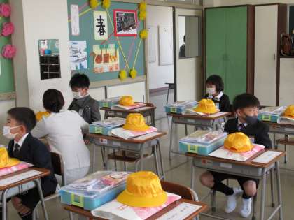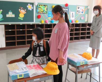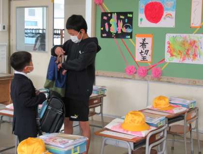 受付を済ませた新1年生。案内係の6年生が甲斐甲斐しく話しかけています。