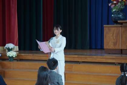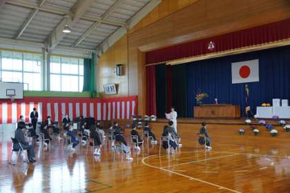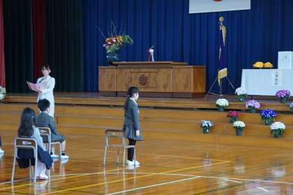 担任の先生が紹介されました。担任の呼名に返事をしています。