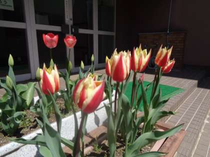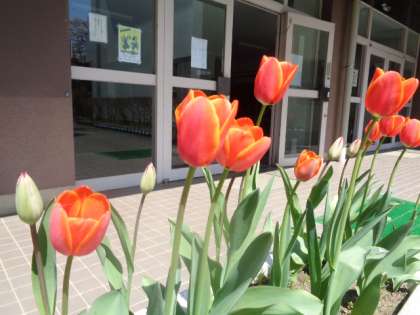 今朝はチューリップもしっかり花を開かせました。1年生の初めての集団登校を迎えてくれているかのようです。