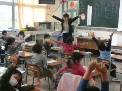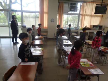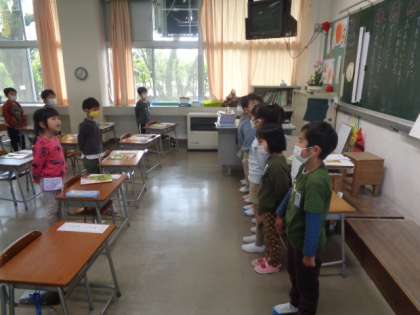 楽しく、繰り返し校歌を斉唱していました。何と、ほとんどの子が、もう歌詞を覚えています。みんなの前に出て披露する子も出てきました。