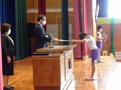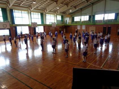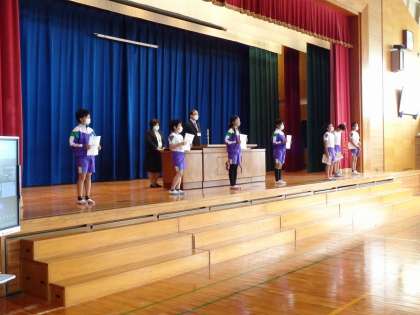 児童会任命式を5、6年生は体育館で、1〜4年生はMeetをつなぎ各教室で行いました。