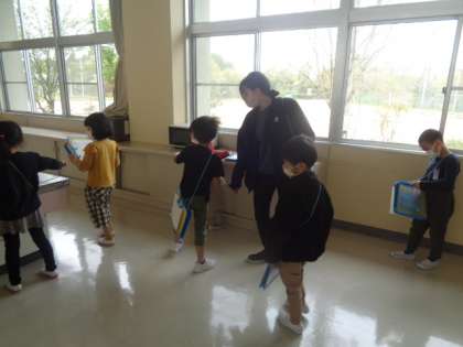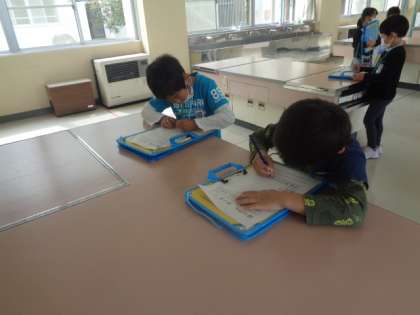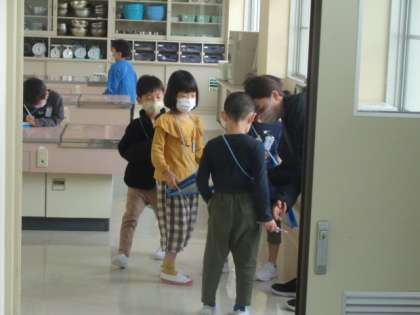 連日、1年生が生活科の学習で、「学校探検」に出かけています。今日は家庭科室周辺を探検している1年生に出会いました。この部屋では、どんな活動をするのか、興味津々でした。