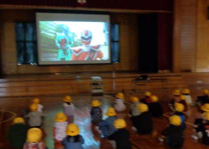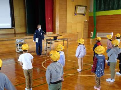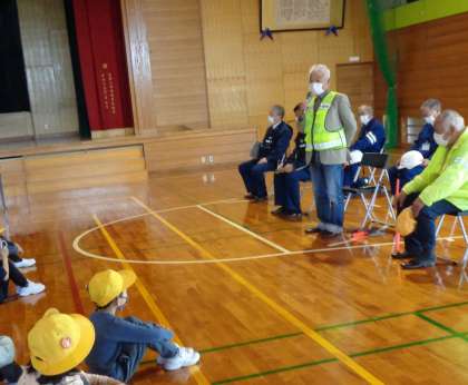 指導にいらっしゃった警察官の方、交通指導員の方、防犯組合の方に元気よくあいさつし、ビデオで交通安全について学びました。