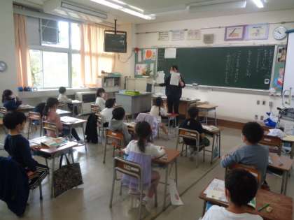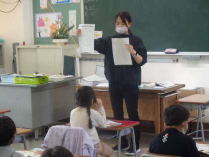 生活科の学校探検で見つけたことを教えあいました。もっと分かりやすく、詳しく教えるために絵カードに書くことを先生から提案されています。