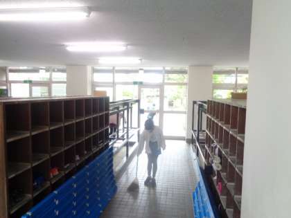 朝清掃の時間に、6年生が保護者の方をきれいな玄関でお迎えするために一心に掃き掃除に取り組んでいました。