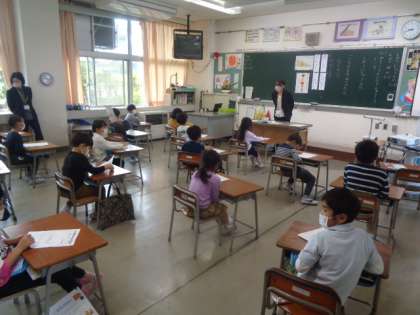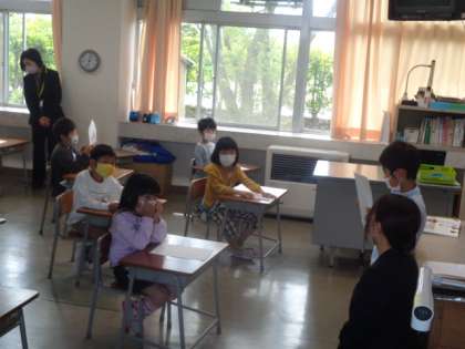 学校探検で見つけたことについて、1人1人みんなの前でお話ししていました。