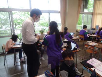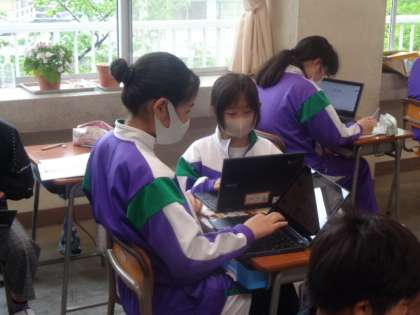 英語での自己紹介を行うために、Googleスライドで要点をまとめています。好きなもの、欲しいもの・・・。詳しい自己紹介をしようと思うと、対応する英単語が知りたくなります。デジタル辞書を活用したり、協働して調べたりするなど、端末をうまく活用しているようです。