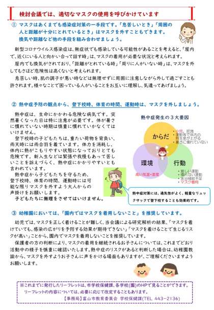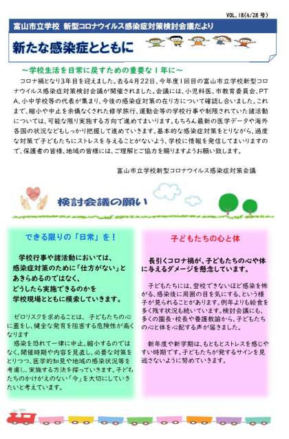 本日、富山市教育委員会より「新型コロナウイルス感染症対策検討会議だよりVoL.18」が発行されました。印刷したものは5月2日(月)に児童に配付します。データは右の「配布文書」欄に掲載します。ご確認ください。