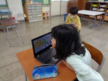 図工の時間には、クロムブックでビスケットというソフトを使ってお絵かきに挑戦しました。5年生のN君が6年生のNさんに優しく教えながら楽しみました。