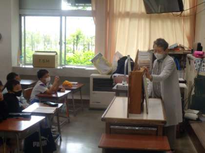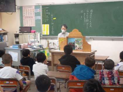 今日は、おはなしの会「夢」さんによる紙芝居の日でした。1,2年生がそれぞれお話の世界にひたりきって楽しんでいました。