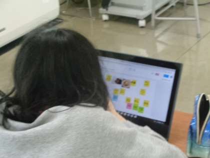 Google Jamboardの機能を使って、詳しく相手に伝えるための言葉を集めています。効果的に画像を使う方法に取り組んでいる場面でした。