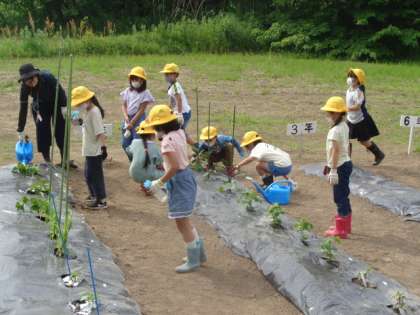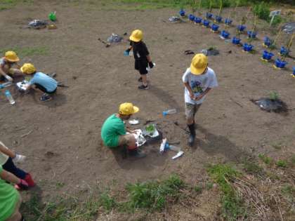 今日も2年生は、畑に出かけてそれぞれの苗の世話をしていました。アルミホイルを持ち込んだり、園芸用の棒を立てたり、それぞれの苗にあった工夫を施しているようです。