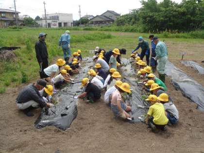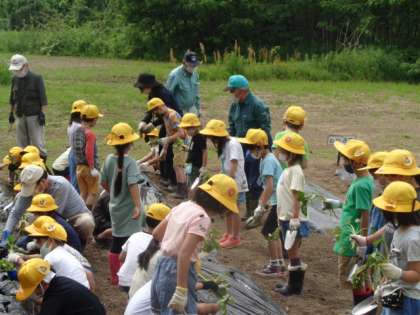 今年も1・2年生が、長寿会の方の手ほどきで野菜の苗を植えました。長寿会の皆さま、ありがとうございました。