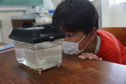 学校のプールにすんでいる水辺の生き物を採取し、調べています。