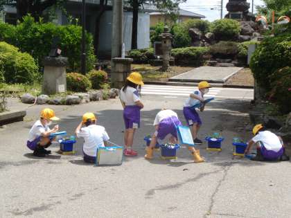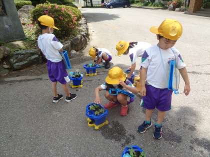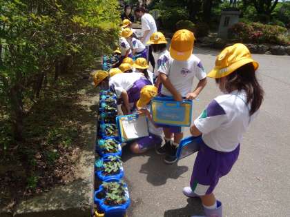 子供たち同様、アサガオがぐんぐん伸びています。観察をして、大きさや色の変化、葉の大きさや数、いろんな変化の気付きを確かめていました。