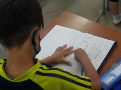 黒板に書かれた明日の連絡内容を、連絡帳に視写している場面です。