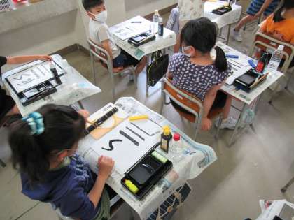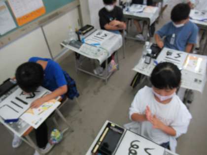 3年生になり、初めての毛筆の学習に取り組みました。書く姿勢や筆の持ち方だけではなく、用具の準備の仕方や片付けの仕方など、多くのことを学習しました。実際に筆で線を書くときは、どの子も慎重に筆を進めていました。
