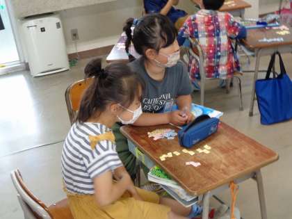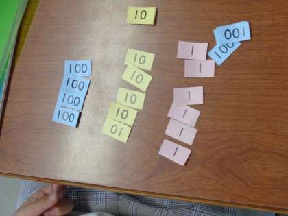 初めは、友達と問題を出し合いました。次に、先生から3けたの数を出題されました。子供たちは、素早くカードを並べ456をつくりしました。