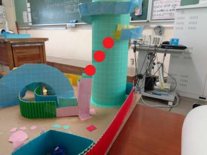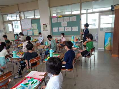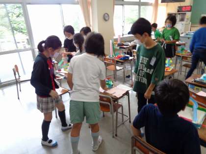 みんなで、友達の作ったコロコロガーレ(ビー玉を転がして遊ぶ工作)で遊んだ後、作品のよかったところを伝え合いました。その中に、何度転がしても必ず穴を抜けて下の筒に入る作品がありました。作ったIさんに聞くと、調整を繰り返しながら作ったとのことでした。主体的に学習に取り組む態度が身に付いています。