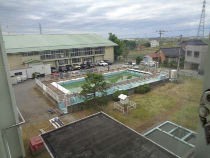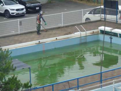 今週金曜日にプール清掃を計画しています。プールの水を少しずつ抜きながら、プールサイドの草刈りやこびりついた汚れを用務員さんがきれいにしてくれています。金曜日は、仕上げの掃除やプールの中の壁磨きを子供たちが行う予定です。