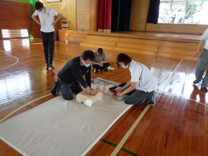 放課後、AEDを使用した心肺蘇生法と緊急時の対応について、呉羽消防署員の方から講習を受けました。PTAからもお二人の参加がありました。