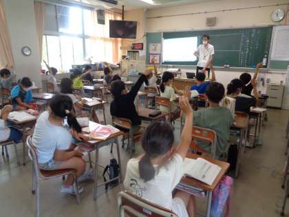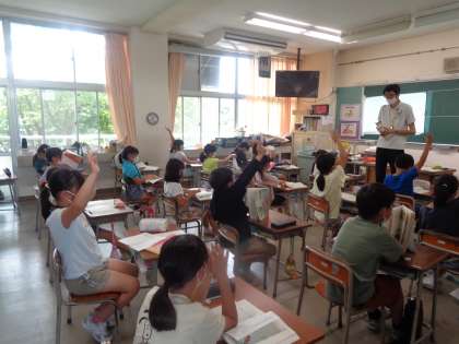 場面ごとの出来事と主人公の変化を確かめました。見つけたことを発言するためにたくさんの手が挙がっています。
