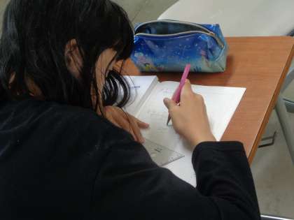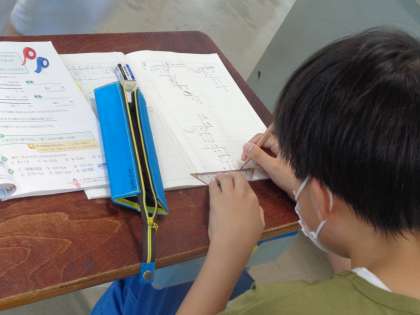 算数の筆算の場面でした。ものさしを器用に使い、手順よく計算していました。