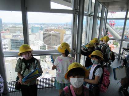 今日の校外学習では、岩瀬の様子や富山市中心部の様子を、自分の目で足で観察してきました。展望台からの町の観察、公共交通機関の利用、市役所食堂の利用など、子供たちはさまざまな体験をしてくることができ、とても満足した様子でした。暑い中でしたが、みんなで元気よく行ってくることができました。