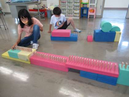 おひさま級のみんなと交流を深めるために、なかよし集会を企画しています。集会で行うゲームを2人で相談して、ドミノ倒しに決めました。楽しいコースになるように、ドミノ倒しを試しに作ってみました。高いところからドミノが落ちて、次のドミノが倒れていくところが楽しいドミノ倒しになりそうです。
