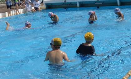 水慣れをした後、色団ごとに水中に沈んだリングを集める「もぐる」活動をしました。まだ、水に潜るのが怖いと感じている子もいます。少しずつ水に慣れていけるように指導をしていきます。
