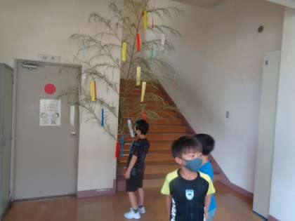 すこやかタイム。七夕飾りに人だかりができました。みんなそれぞれの願い事を見上げています。