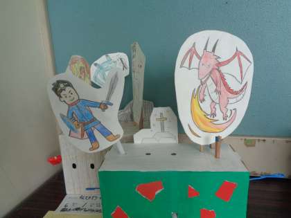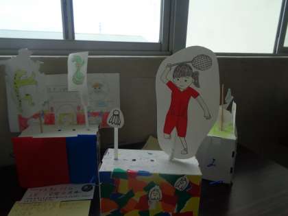 クランクで動く仕組みを使って、動きのある仕掛けを作りました。思わず回してみたくなりましたが、まだ制作途中の子もいるのでしょう。「さわらないで!」の張り紙がしてありました。来週以降には完成するのでしょう。学校の人気コーナーになりそうです。