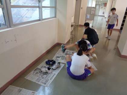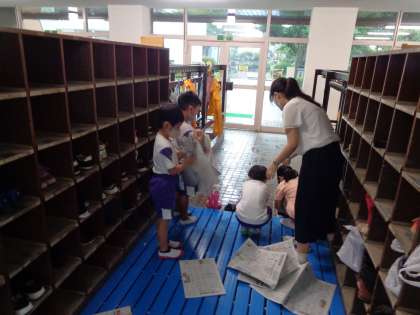 また濡れた外履きには、古新聞をつめさせて、下校時には少しでも歩きやすくなるよう指導しています。