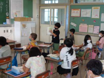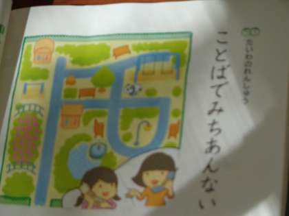 教科書の絵地図をもとに、行ってほしいところに案内するために、言葉での道案内に挑戦しています。