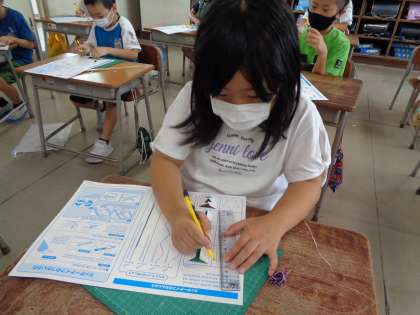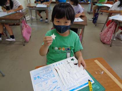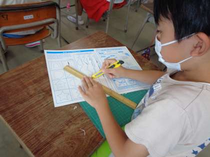1学期に引き続いてカッターナイフで安全に気をつけていろいろな形を作れるようになるために、練習に取り組んでいます。